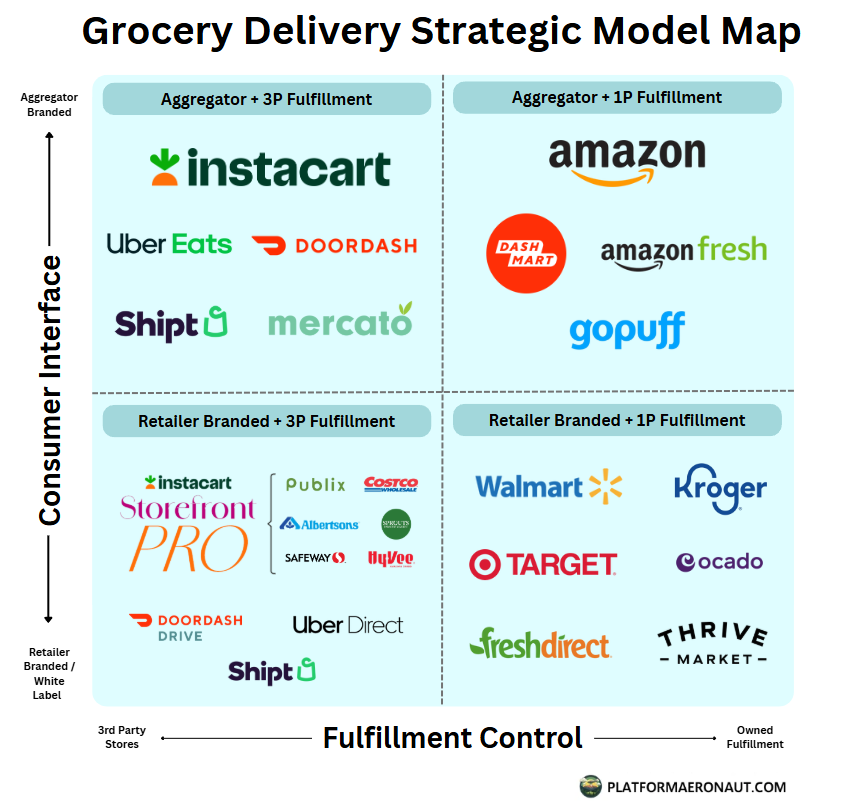 The online grocery landscape can be charted on a quadrant defined by who owns the consumer interface (aggregator vs retailer-branded) and who controls fulfillment (3P stores vs 1P fulfillment). I’ve mapped out the major players in the US market into the four quadrants below.
