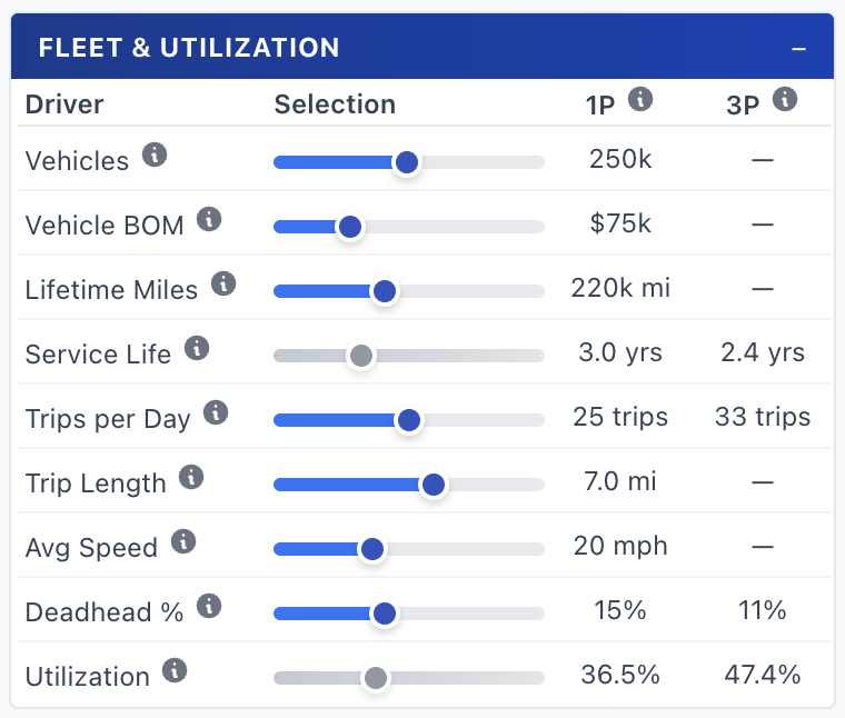 At its core, AV Rideshare Economics is an interactive, bottoms-up unit economics model for autonomous rideshare. It’s designed to let you toggle assumptions and immediately see how they flow through to per-trip economics, contribution margin, EBITDA, and operating profit. Rather than baking in a single “right” view of the world, the site is built around the idea that reasonable people will disagree on inputs and that the only productive way to debate those disagreements is to model them.
