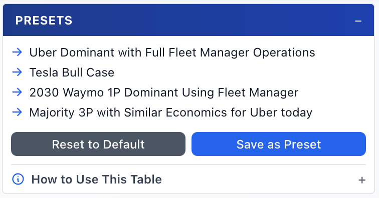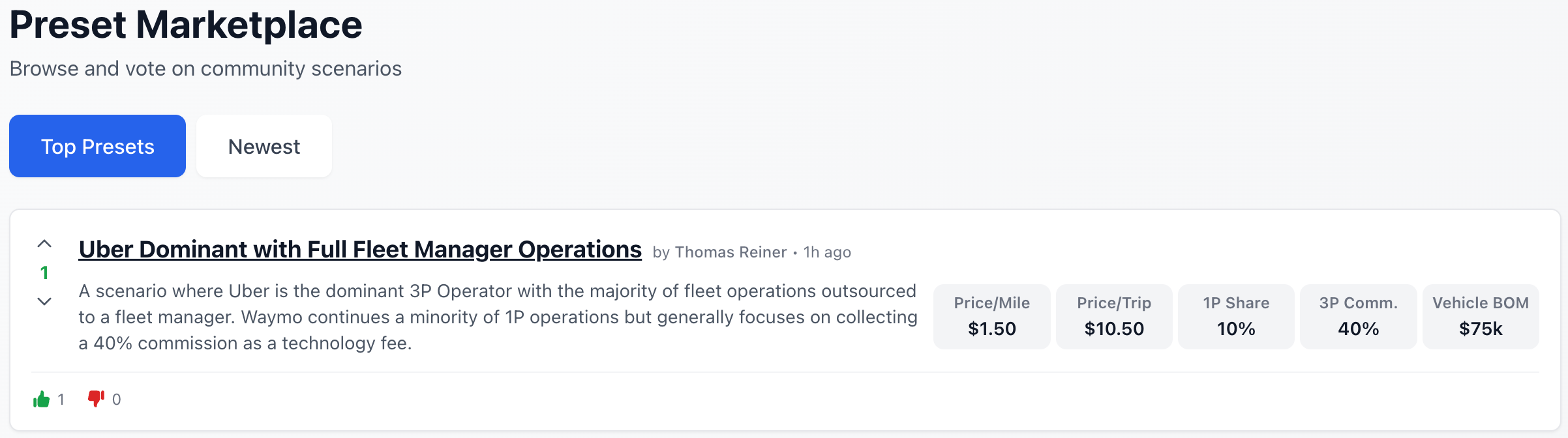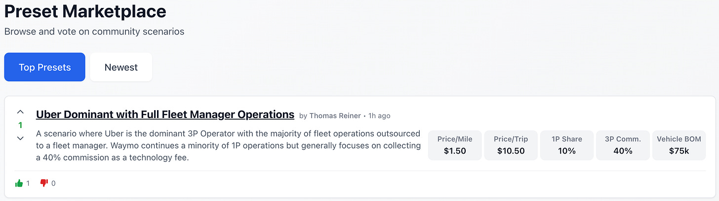 My hope is that this becomes a shared sandbox for thinking rigorously about autonomous rideshare economics. If you think the model is wrong, save a preset and show where the economics break and share it with me. If autonomous rideshare is going to reshape transportation, it will do so because the numbers work. This tool is my attempt to keep that conversation grounded in reality.