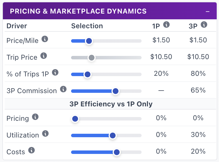 This is the crux of the argument from players like Uber: even if you give up 30–50% of gross bookings as a commission or revenue share to the 1P Fleet Operator, materially higher utilization and faster market expansion can improve absolute dollar economics. The model lets you explicitly test that claim by adjusting utilization uplifts, commission rates, and pricing power side by side.