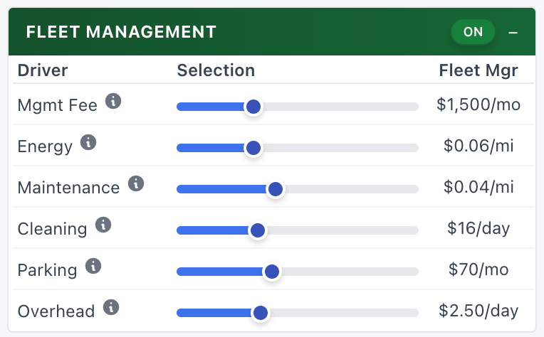 The model explicitly separates fleet manager revenue and costs, allowing you to see: