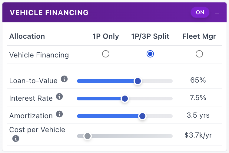 Finally, the model incorporates vehicle financing, which is often glossed over despite being critical. Autonomous fleets are capital-intensive, and who finances the vehicles (and at what cost) materially changes outcomes.