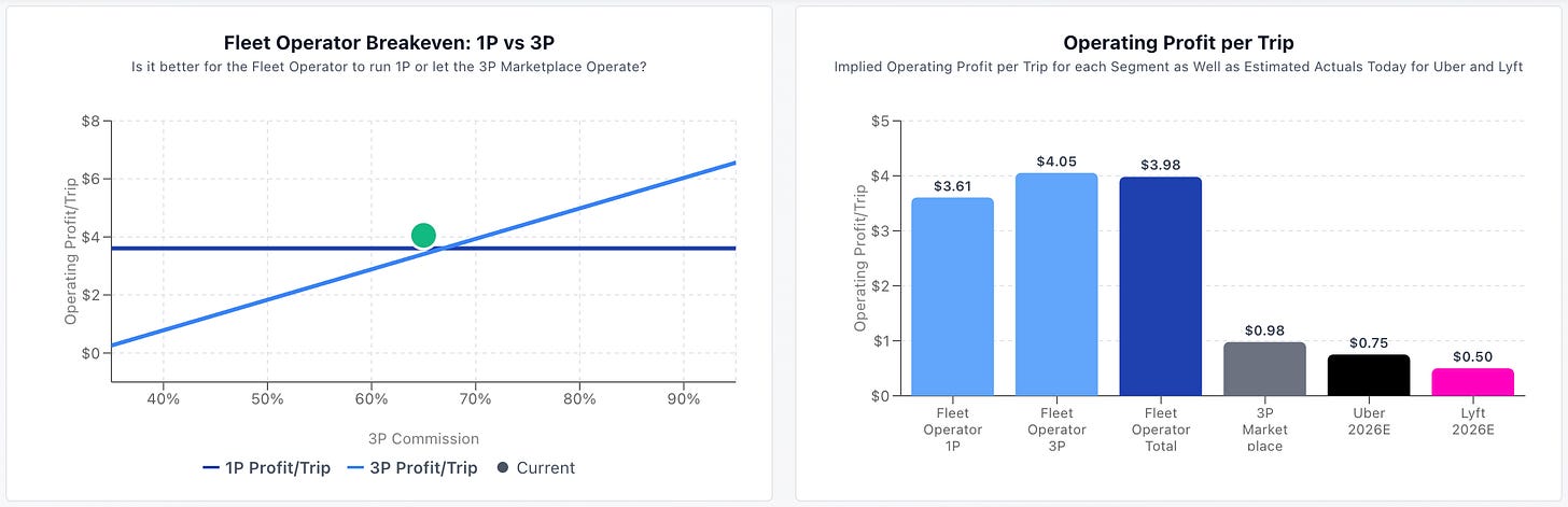 The framework supports both first-party (1P) and third-party (3P) operating structures, explicitly separating the economics of the autonomous vehicle provider, the marketplace/aggregator, and the fleet manager where relevant. The goal isn’t to predict winners, but to define the narrow corridors where each model actually works.
