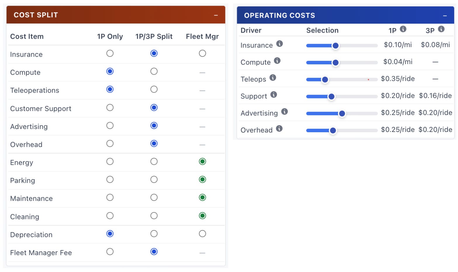 An interactive model to pressure-test the assumptions behind first-party, third-party, and hybrid autonomous rideshare business models.
