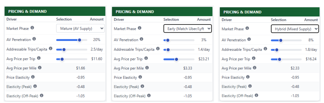 Additionally in the model I set up three default market phases that affect pricing, penetration, and addressable trips per capita (as well as some of the cost levers). I’ve defaulted it to “Mature” which implies an addressable TAM of 2.5 trips per day per person and AV penetration of 20%. We are nowhere near that today with most cities at 2-3% penetration and high density metros at 5-8%. But in a world where AV rides might cost $10-12 perhaps 20% is possible. If that feels too aggressive to you there are “Early” and “Hybrid” defaults or you can change assumptions yourself.
