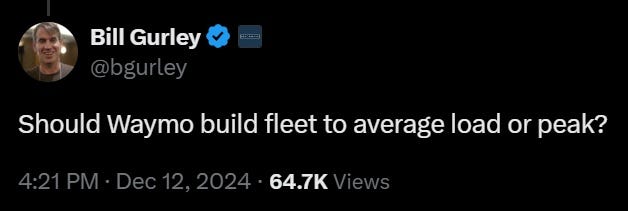 Bill Gurley has frequently asked the question of whether Waymo should build to peak demand or average? What makes economic sense? What is optimal from either an individual per ride basis or more importantly on a fleet-wide total profitability basis?