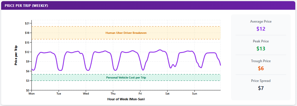 In this mature market phase scenario where does pricing sit? With an average price around $12 and trough around $6 you fall pretty squarely in the sweet spot for a fleet that Waymo or Tesla might run. Ideally you want your pricing below the above yellow line where human rideshare drivers breakeven. Below $16-18 per trip, a human driver will stop driving as it no longer makes financial sense.