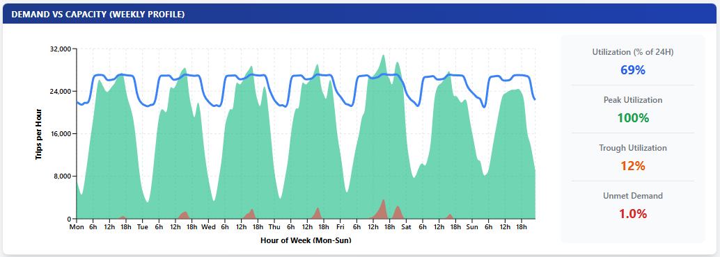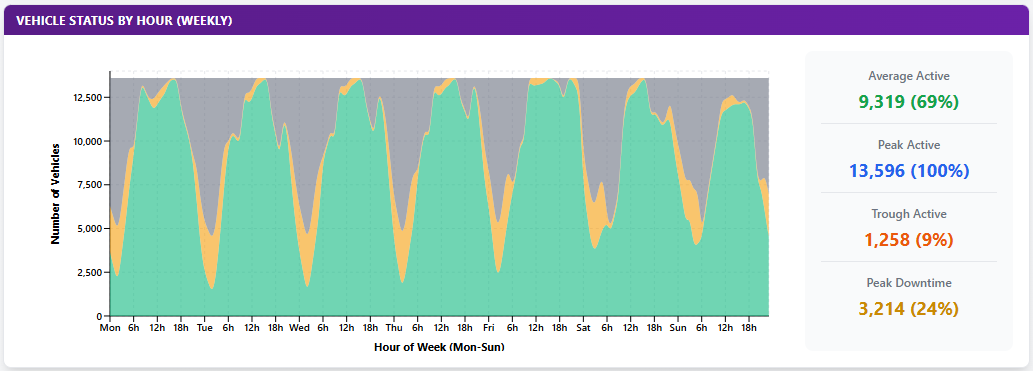 To more accurately model this dynamic I had the model include active vs downtime vs idle vehicles by hour of day and allocate downtime to off-peak periods so that vehicles are available for as much peak demand as possible.