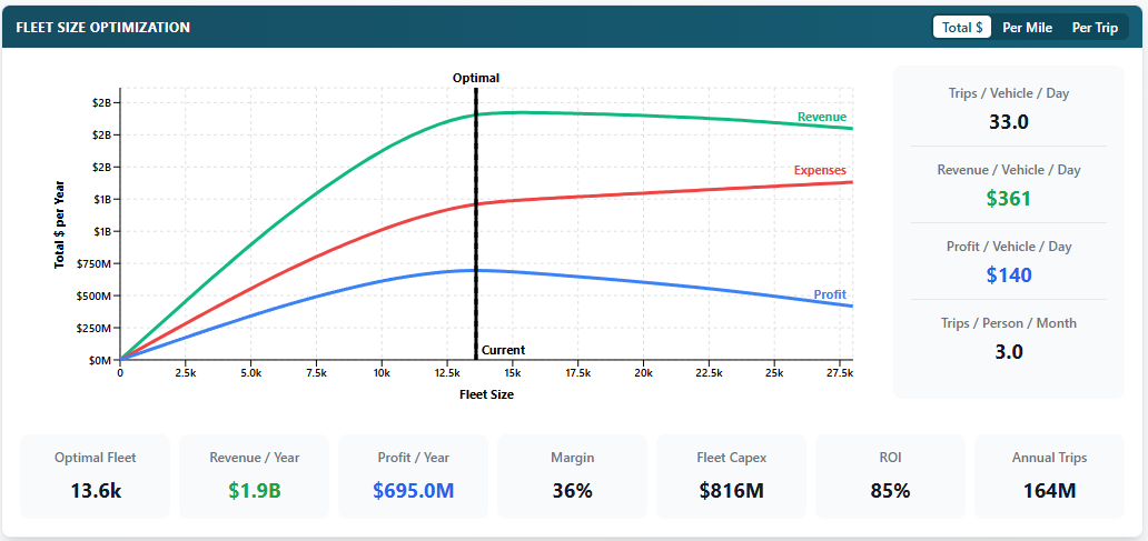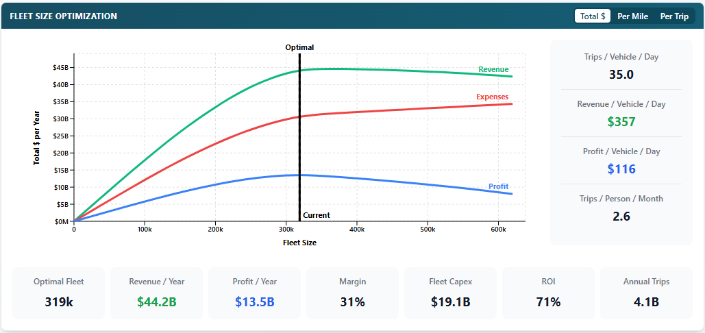In this model, “optimal” fleet size is defined as the point that maximuzes total fleet-level profit, not per-vehicle utilization and not per-ride margin.