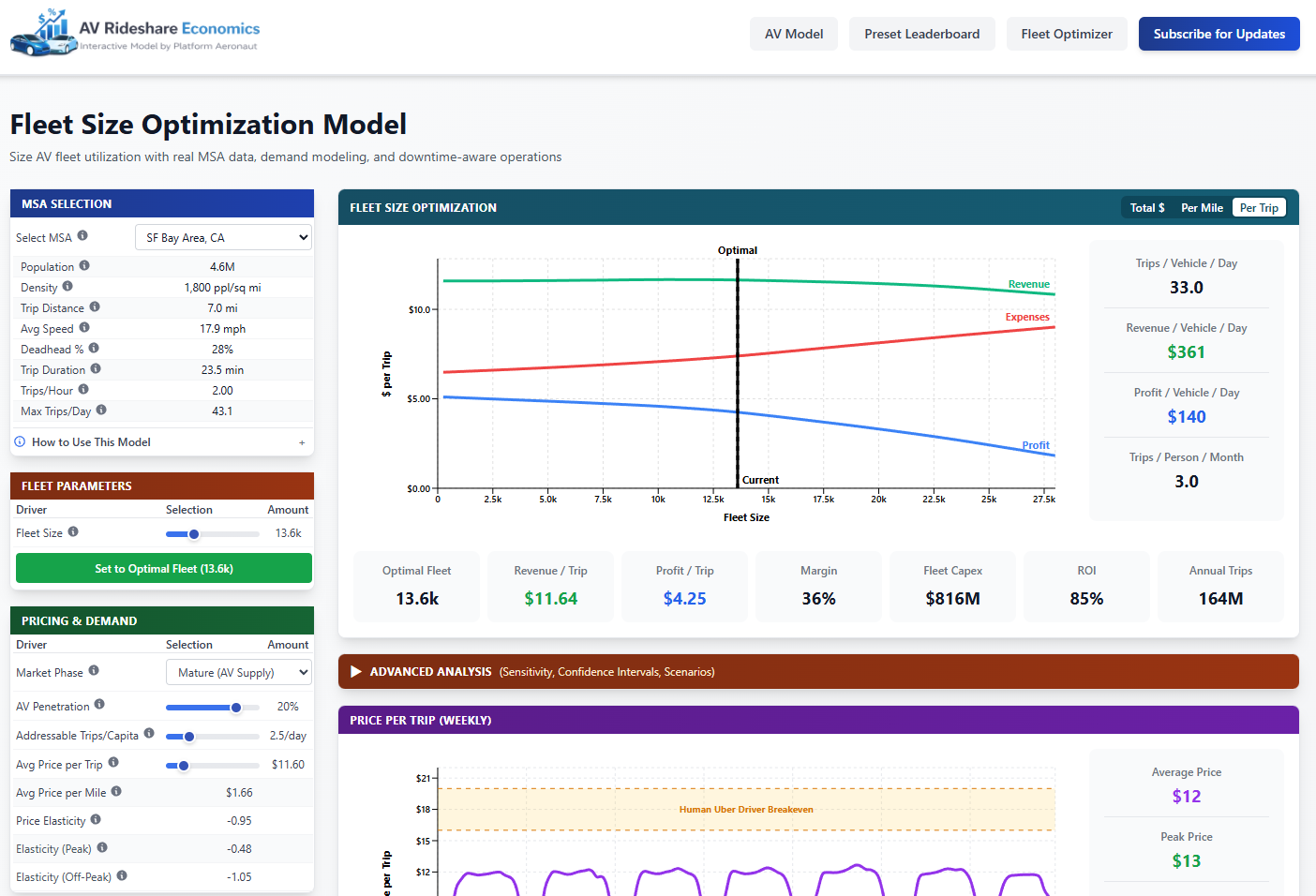 An interactive model to pressure test optimal fleet size by MSA and city. Should AV fleets be sized to peak, average, or trough demand?