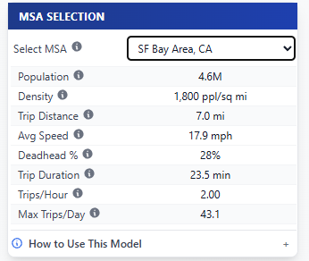For each MSA I pulled down population, density, and other relevant statistical data and applied a regression against a variety of known data for Uber and Lyft rides today to spit out an average trip distance, driving speed, and deadhead % (time between trips). That provides an output for trip duration (23.5min for SF), trips per hour (2 for SF), and maximum trips per day (43.1).