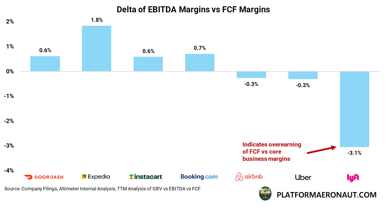 I like to look at EBITDA margins (to GBV) vs FCF margins to see if there’s any outliers, and Lyft remains the big one, generating way more FCF as a % of GBV than they are EBITDA. There’s just a significant amount of working capital benefit that Lyft is accuring that none of the other similar companies are seeing. I’d expect this to reverse and normalize over time but something to keep an eye on.