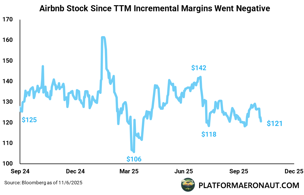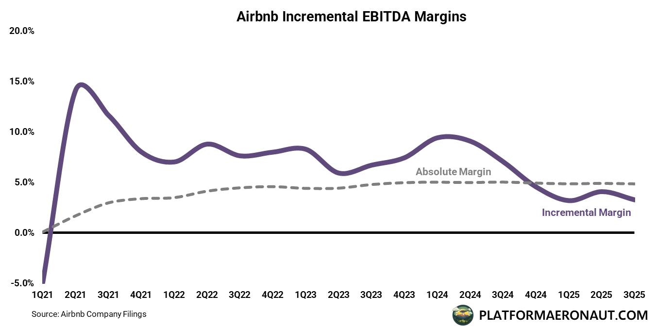 While they’re certainly re-investing into the product and trying to re-launch experiences and services and create a host marketplace, the incremental margins at Airbnb are horrendous and have consistently been getting worse: