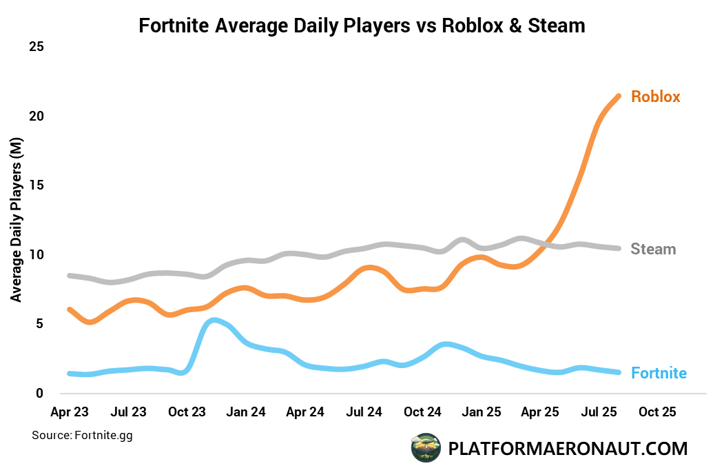Pulling together average daily player counts for Fortnite, Roblox, and Steam you can see the lack of traction and expansion for Epic beyond the core Battle Royale mode in the game: