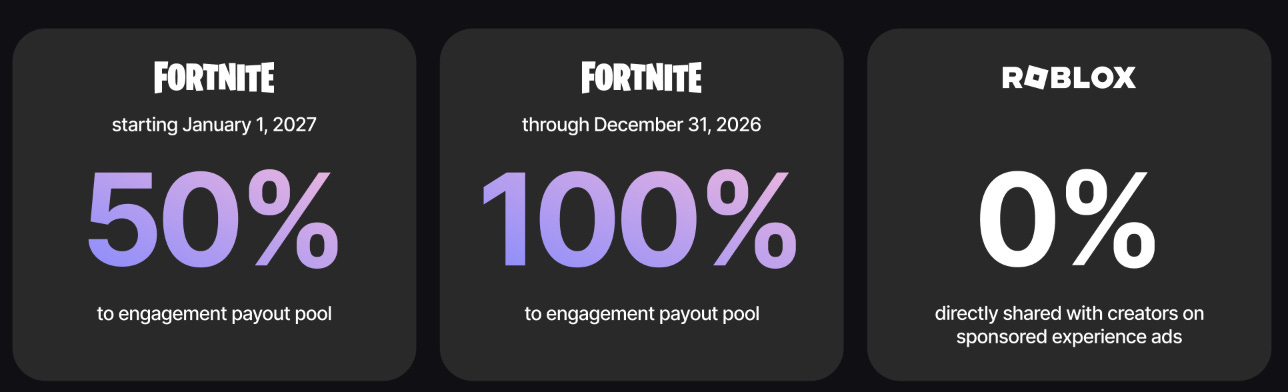 Since the launch of UEFN Epic has used an engagement based payout through a pool of approximately 40% of net revenue. Essentially if there is $100 of revenue and 100 hours on Fortnite that makes an engagement pool of $40. That $40 is divided up into 1P and 3P based on engaged hours. Today with 3P being ~40% of hours that’s approximately $16 out of $100 of revenue going directly to creators.
