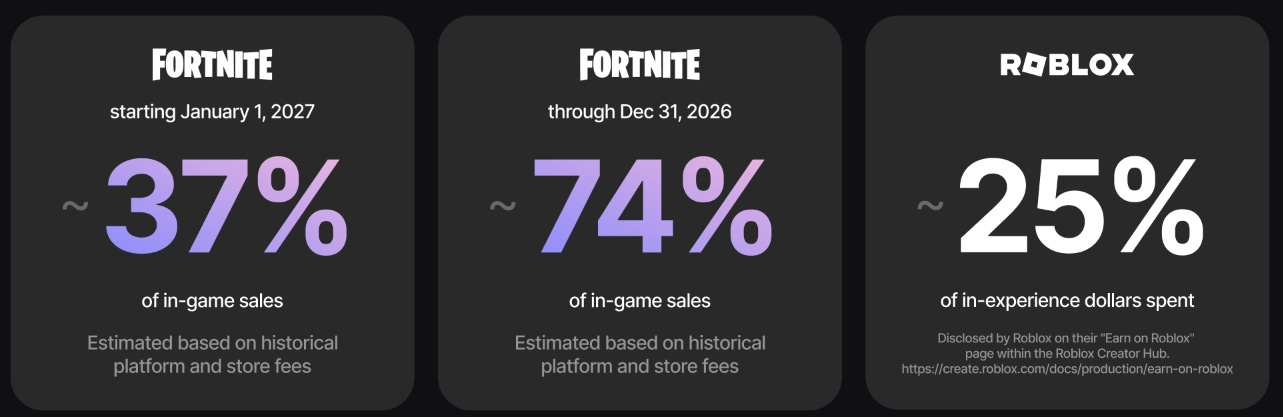 Most importantly here is that through the end of 2026 74% of all in-game items sold by a developer will go to the game developer themselves versus approximately 25% on Roblox.