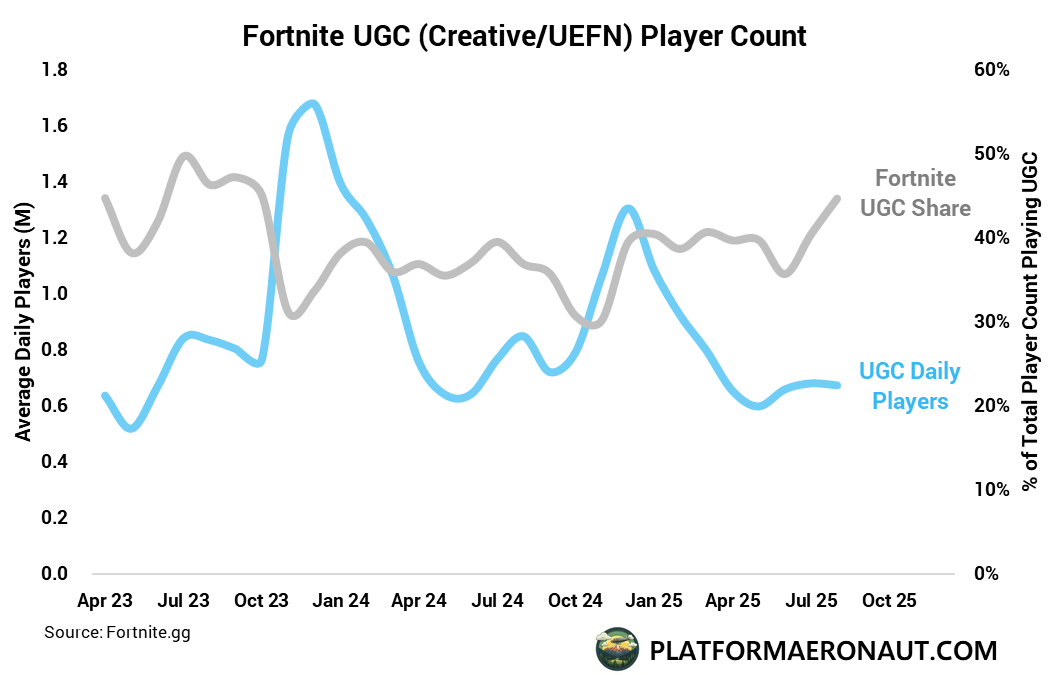 Fortnite has sustained an extremely solid core player base for the core Epic created modes like Battle Royal, Reload, and Fortnite OG. Coming out of covid they saw the same sort of negative player tailwinds as life normalized as the rest of the industry saw, but there were high hopes that a push into UGC would invigorate the player base and hand the keys over to developers. When they launched UEFN (Unreal Engine for Fortnite) there were big expectations, after all it was a super powerful skinned version of Unreal Engine 5 specifically for Fortnite that theoretically would allow independent developers to create game experiences that were quasi-AAA quality but within Fortnite’s walled garden, but riding that distribution channel.