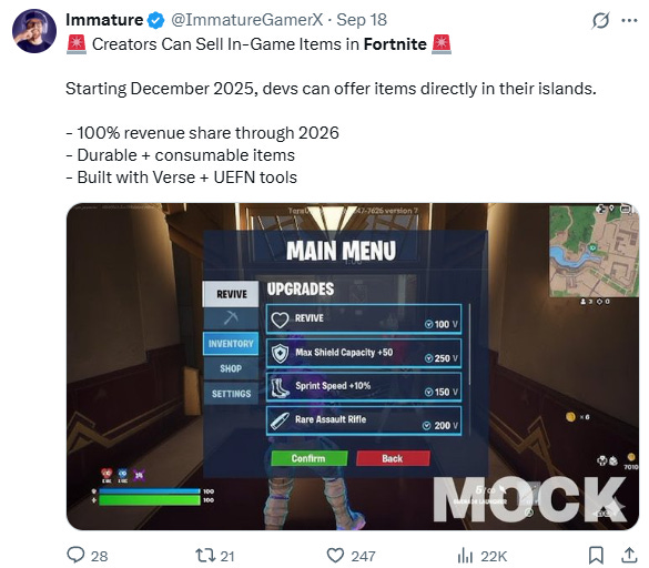“Developers will use a Verse-based API and new UEFN tools to create and offer purchasable durable items and consumable items in their games. We’ll share more details soon.”