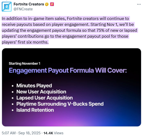 For the next six months, Epic will pay out 75% instead of 40% if they bring in new players to the platform or re-engaged lapsed players. This should directly improve cohorts and re-activations from older cohorts.