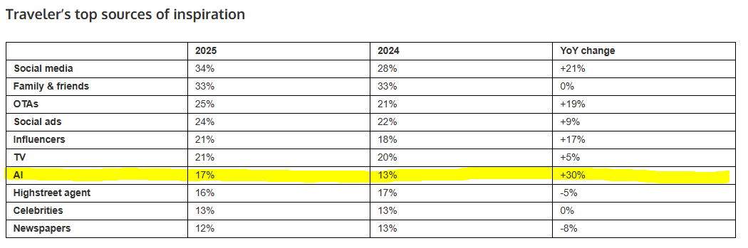 Amadeus research shows AI shift in travel planning showing a big jump in inspiration from AI year-over-year to 17% as a top source.