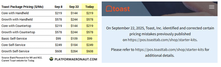 On Monday 9/22 Baird analyst David Koning published a note that the Toast website had trimmed pricing for their software packages by 26-58% which sent the stock down 9.5%. Shortly afterwards the company reverted the pricing and put a notice on their IR website