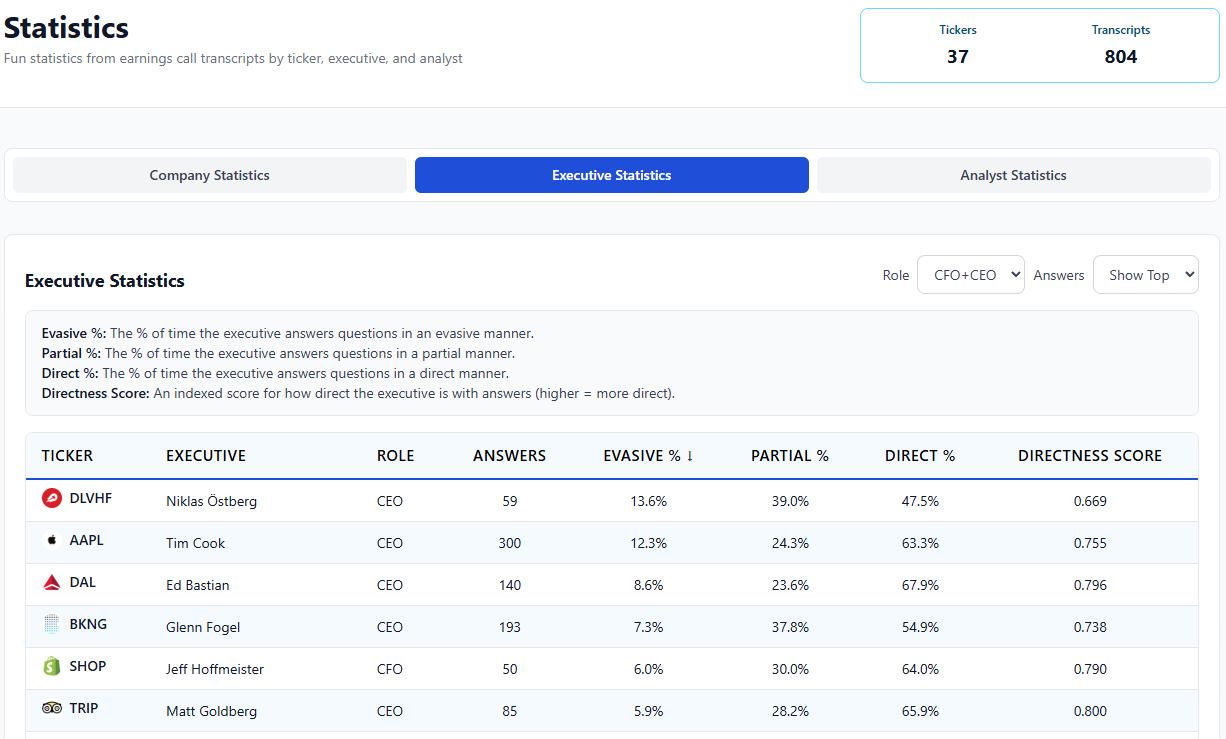 Now that I have a giant database of transcripts, executives, Q&A, and other details I can compile statistics. There’s a lot of heavy lifting to do and I’ll continue to flesh this out, but for now I have tagged stats like what % of time is an executive’s Q&A response evasive vs a partial answer vs direct?