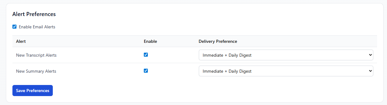 From there you can enable alerts for new transcripts and new AI summaries and choose immediate, daily digest, or both.