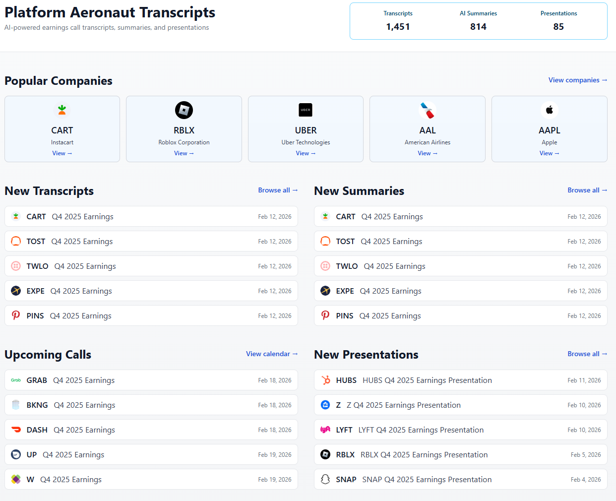 Platform Aeronaut Transcripts is a workflow-first research site focused on public-company earnings calls that provides one place to monitor what’s new, read the call, skim a structured summary, grab the deck, and track what’s next.