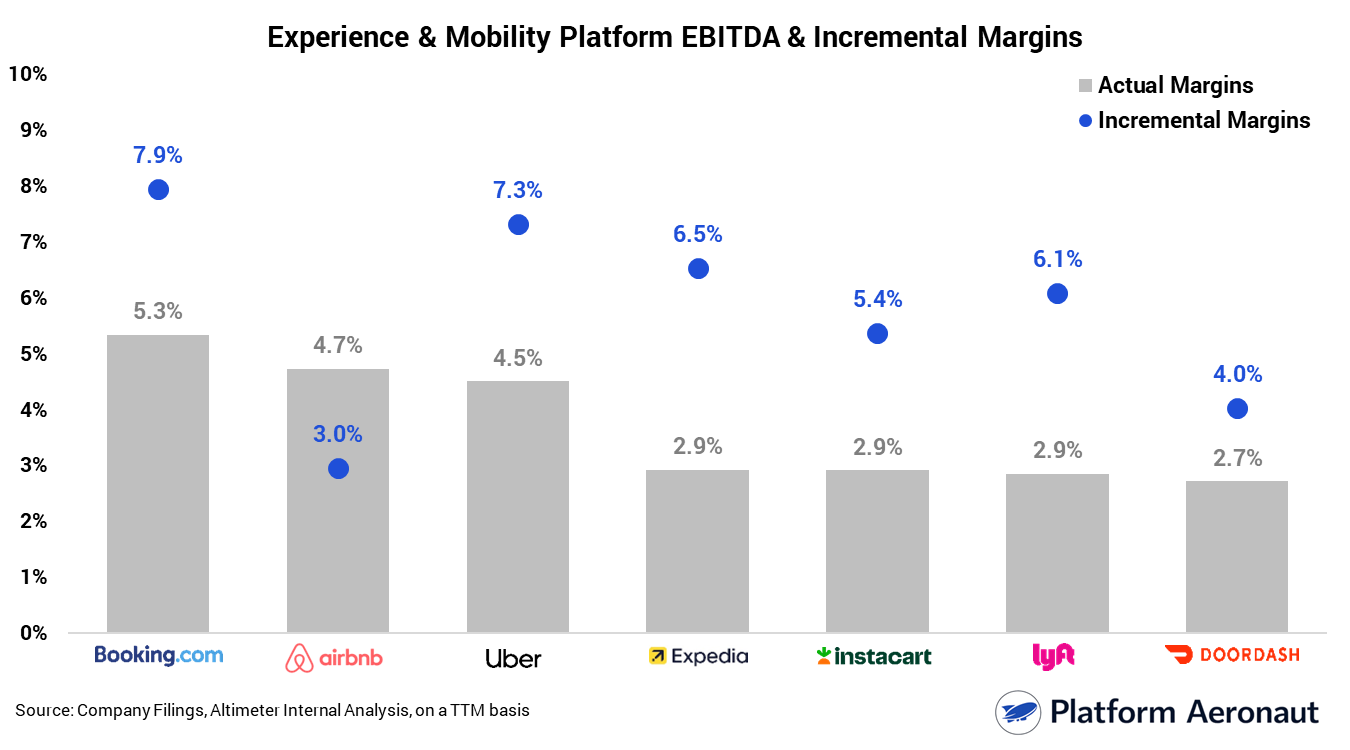 Uber presents a more interesting case. At 4.5% actual and 7.3% incremental, the gap is large (nearly 300 basis points) which implies meaningful operating leverage as the business scales. Uber has been on a deliberate path toward EBITDA discipline after years of growth-at-all-costs, and the incremental margin profile here suggests that path is working. Every dollar of incremental GBV is being converted at a much higher rate than the blended base. The delivery and freight businesses still compress the consolidated number, but mobility’s underlying economics are pulling the incremental rate up materially.