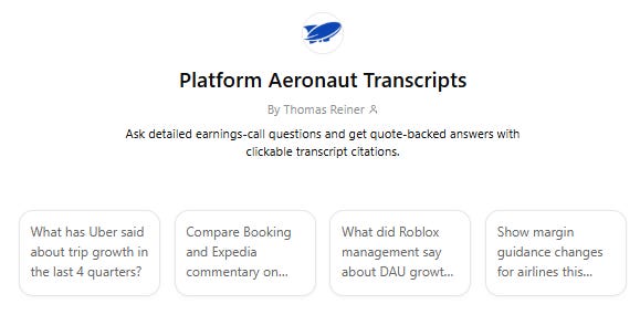 I’ve built a CustomGPT on ChatGPT that lets subscribers search and query across the full archive of Platform Aeronaut transcript records. Rather than scrolling back through issues to find what a specific exec said about AV unit economics or margin guidance, you can now ask directly.