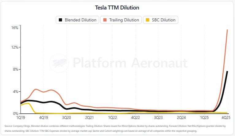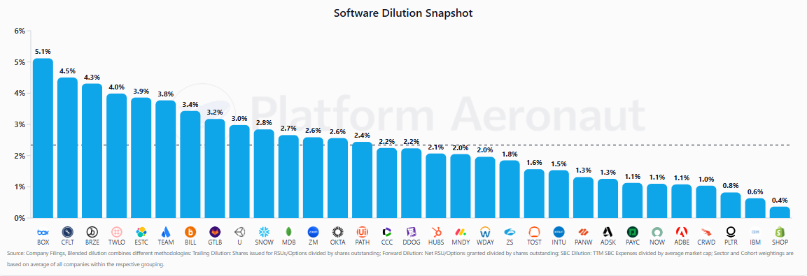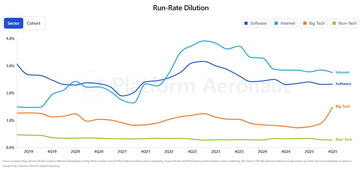 Today I’m launching Platform Aeronaut Dilution, a live, queryable platform for public-company SBC and dilution analytics. It covers 80+ companies across Big Tech, Internet, Software, and Non-Tech, updated quarterly as earnings roll in. Think of it as the dilution analysis I’ve been publishing, except interactive, permanent, and filterable.