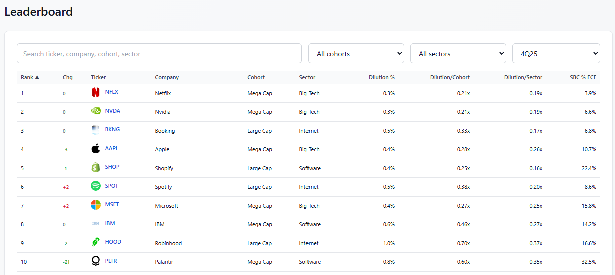 Netflix and Nvidia are tied at the top with 0.3% run-rate dilution. BKNG comes in at #3 with 0.5% (consistent with how I’ve always characterized them as the gold standard for SBC discipline in the internet cohort.) Apple, Shopify, and Spotify round out the top six. The leaderboard is filterable by cohort (Mega Cap, Large Cap, Mid Cap, Small Cap), sector, and quarter going back to 2018.