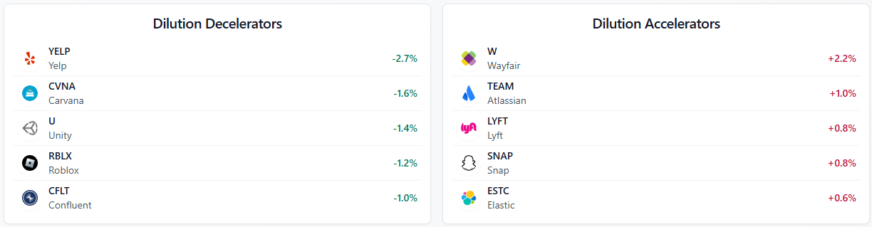 From the current data: YELP is the top dilution decelerator meaning their forward dilution today is better than their blended dilution implying future deceleration to their dilution rate. On the dilution accelerators side, Wayfair increased 2.2 points and continues to be one of the more egregious diluters in the coverage universe. Lyft, Snap, and Atlassian are also on the wrong end of the movers list. None of those should surprise anyone who’s read the prior posts.