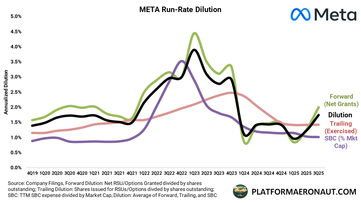 Forward dilution is jumping up because of Meta specifically. YTD 2025 through Q3 Meta has issued 49m RSUs net of cancellations versus 38m net issued for all of FY2024. AI engineers are expensive.