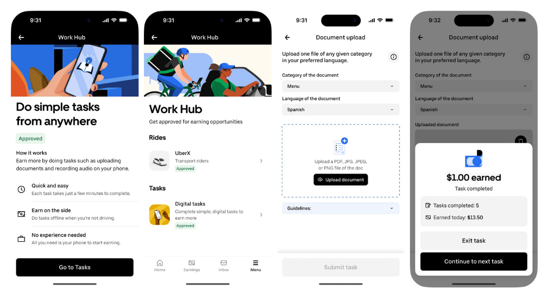 Uber is quietly turning the Driver app into an on-ramp for AI work. Select U.S. drivers and couriers can now complete bite-sized “digital tasks” (voice clips, menu/photo uploads, document snippets, multilingual prompts, etc) to train models and earn between trips. It’s classic Uber and the push into monetizing the flywheel: find latent supply → instrument it with product → route demand through a marketplace. Instead of rides and deliveries, the “ride” is RL/labeling instead of a passenger. The pilot is live and positioned explicitly as new, flexible work layered on top of mobility and delivery, with Uber itself advertising data-labeling and testing services on the corporate site.