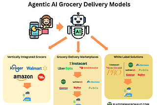 App Marketplaces (DoorDash/Uber/Instacart), White-label Storefronts (Instacart), and Vertical Integrations (Amazon/Walmart) in an AI-Agent first world.